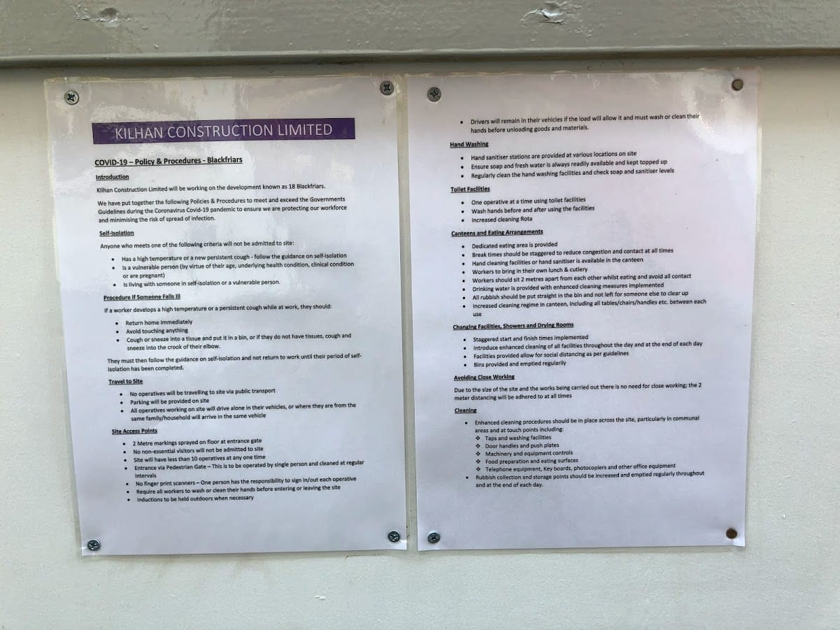 This week new notices setting out 'COVID-19 policies and procedures' have been posted around the site boundary by Kilhan Construction Ltd.